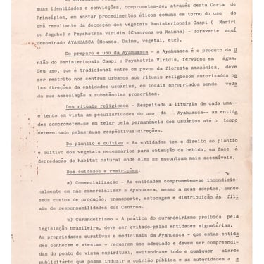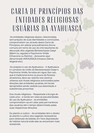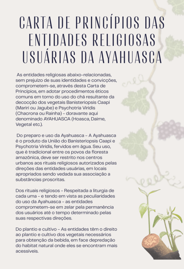 As entidades religiosas abaixo-relacionadas, sem prejuízo de suas identidades e convicções, comprometem-se, através desta Carta de Princípios, em adotar procedimentos éticos comuns em torno do uso do chá resultante da decocção dos vegetais Banisteriopsis Caapi (Mariri ou Jagube) e Psychotria Viridis (Chacrona ou Rainha) - doravante aqui denominado AYAHUASCA (Hoasca, Daime, Vegetal etc.).