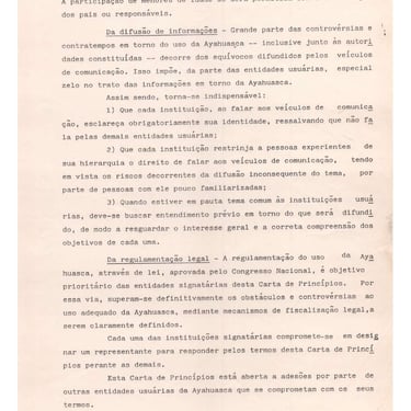 Da regulamentação legal - A regulamentação do uso da Ayahuasca, através de lei, aprovada pelo Congresso Nacional, é objetivo prioritário das entidades signatárias desta Carta de Princípios. Por essa via, superam-se definitivamente os obstáculos e controvérsias ao uso adequado da Ayahuasca, mediante mecanismos de fiscalização legal, a serem claramente definidos.